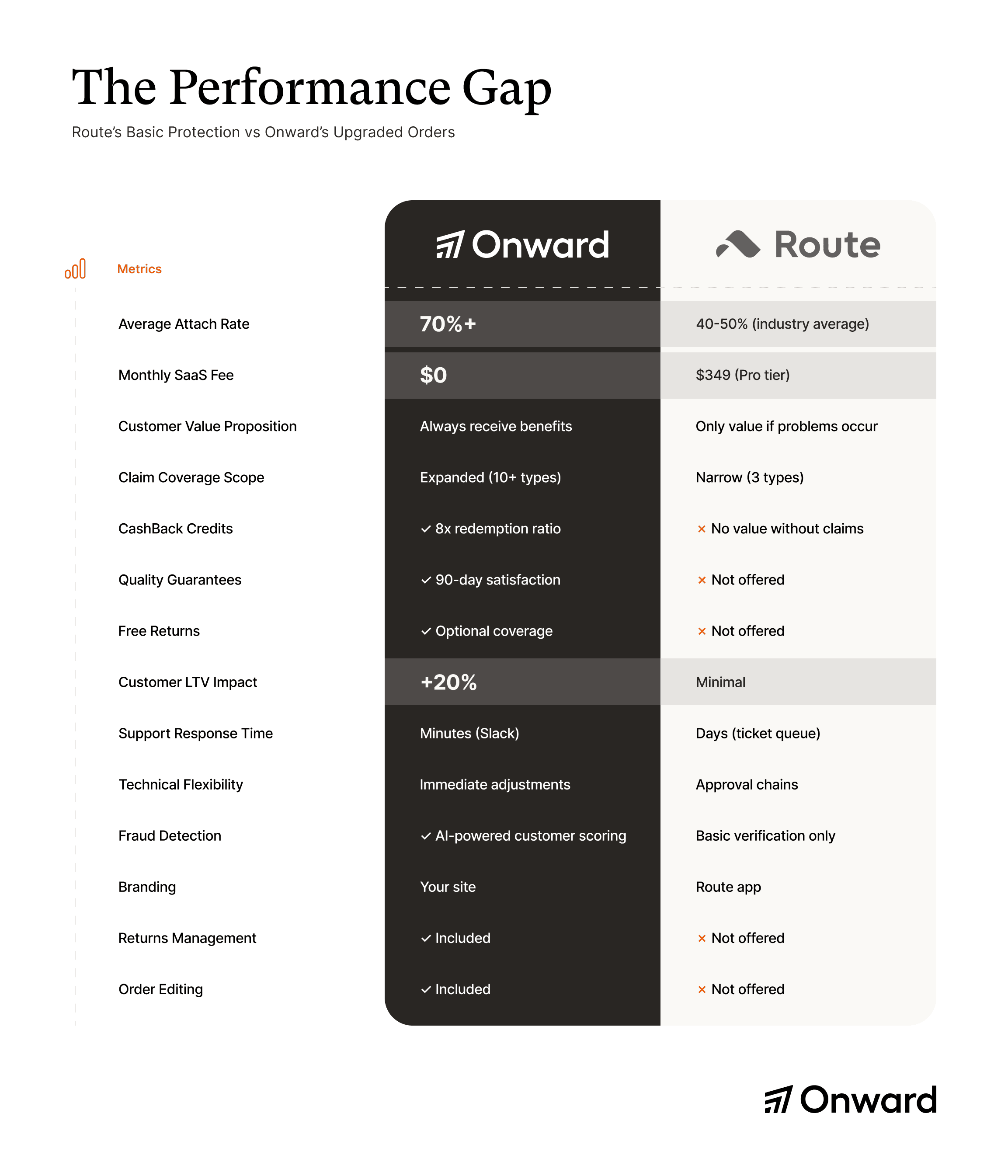 The difference: Onward is a modern SaaS company constantly iterating based on merchant feedback. Route operates like a mature company optimizing existing offerings rather than solving emerging merchant needs.