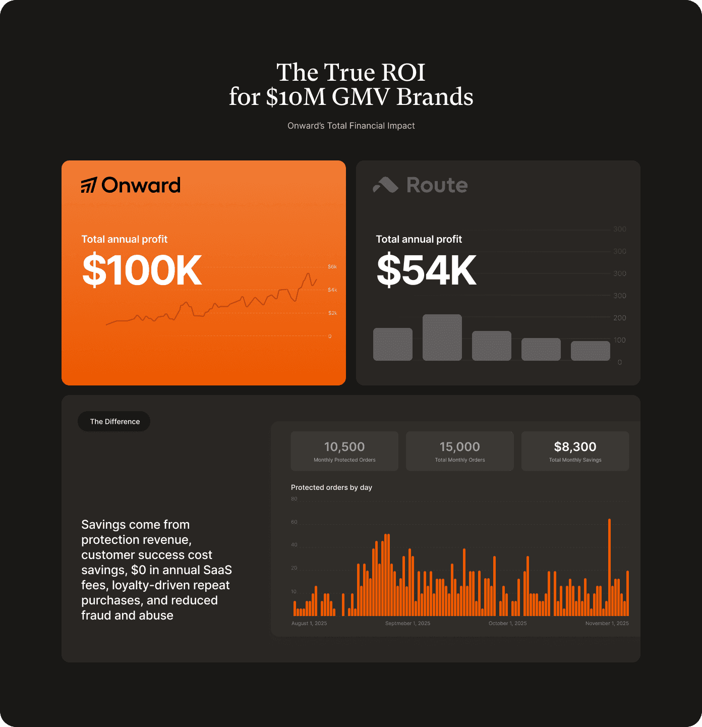 Real ROI: Onward doubles the financial impact of basic protection platforms while eliminating SaaS fees. The SaaS savings are just a bonus on top of 2x the profit. For every $10M in GMV, Onward typically delivers $100K+ in annual profit.