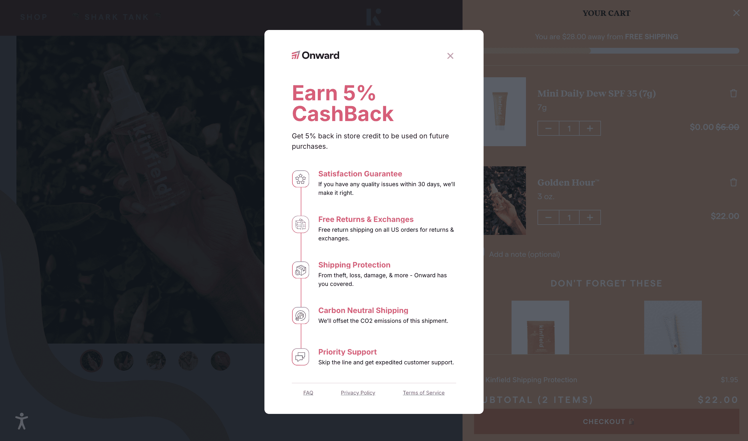 Adding to the convenience of Kinfield’s elevated customer experience with Onward, shoppers can now opt-in to any post-purchase services right at checkout using Onward’s shopping cart widget. What’s more, after a customer places an order, Onward follows up with a Kinfield-branded satisfaction email, reinforcing customer relationships and ensuring every shopper is pleased with their purchases.